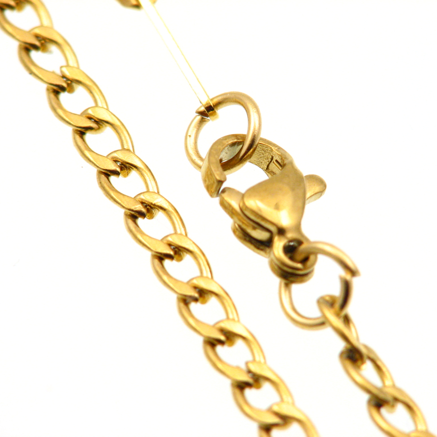 Lanac 5 x 3 x 0,8 mm od medicinskog čelika 304 SS, galvaniziran specijalnom ION galvanizacijom, 50 cm dužine, dolazi s kopčom karabinerom od medicinskog čelika, boja zlatna