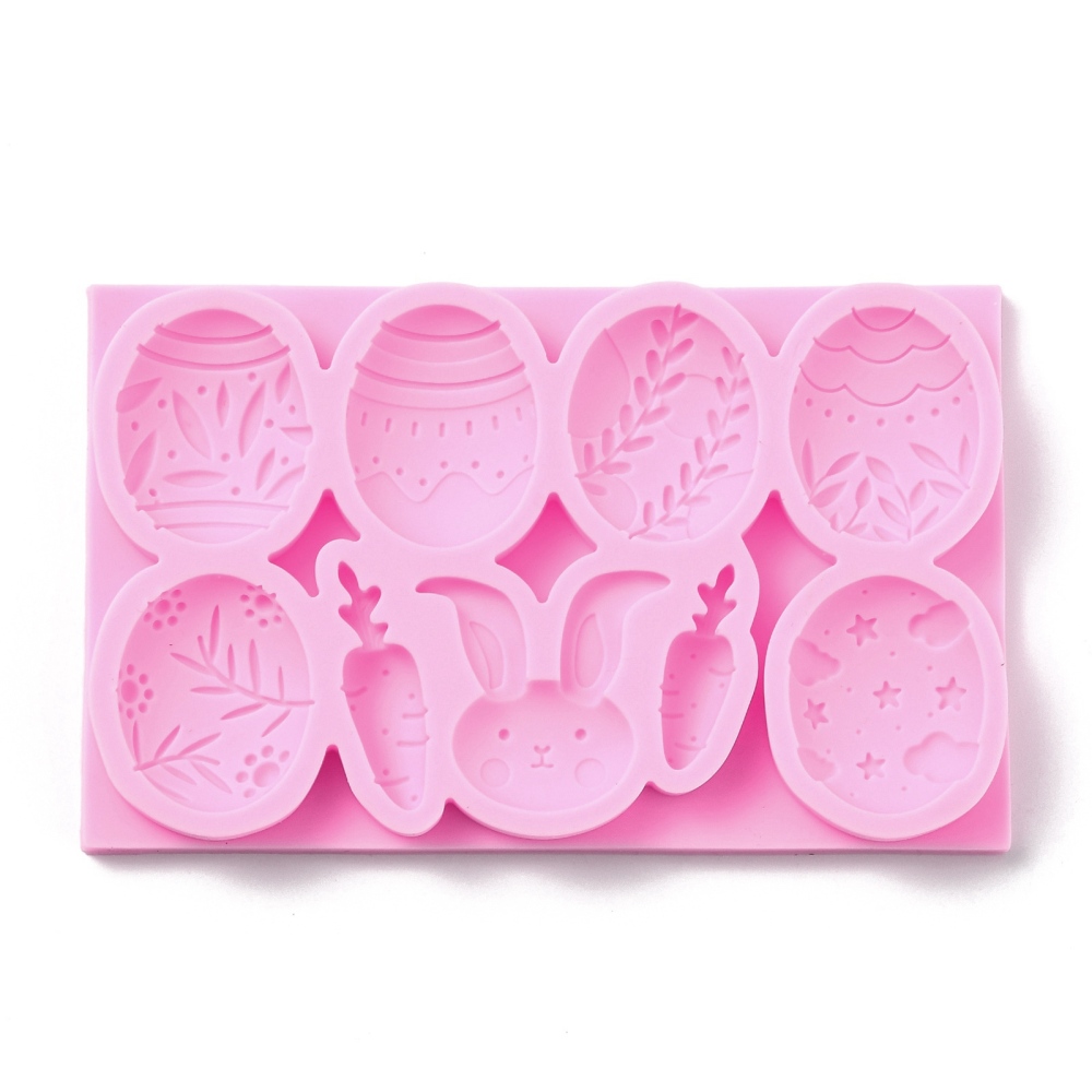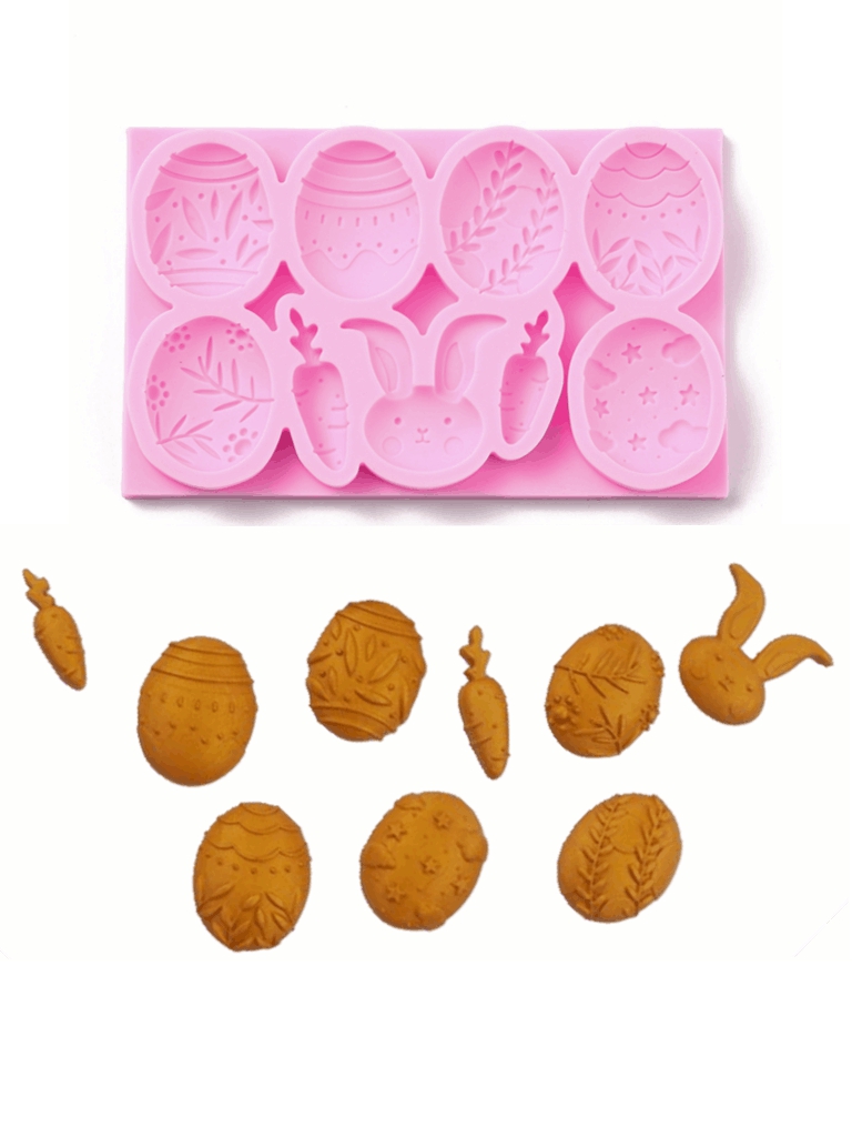 Kalup silik. Uskrs , 1. jaja: vel 34x27mm, 4 komada, jaje vel 35x28mm, 2 komada; 2. Mrkva: 1.(38x11mm), i (31x10mm); 3.Zec: 35x36mm.