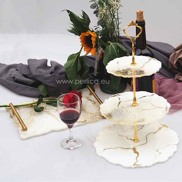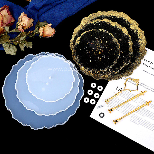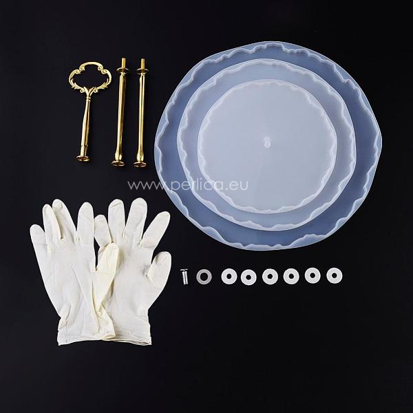 Kalup silikonski sastoji se od tri podloge ili tacne koje se spajaju s metalnim nosačem koji dolazi u kompletu. Namijenjen je izradi zdjele za voće ili kolače od epoksi ili UV smole. U paketu dolaze i rukavice za jednokratnu upotrebu.