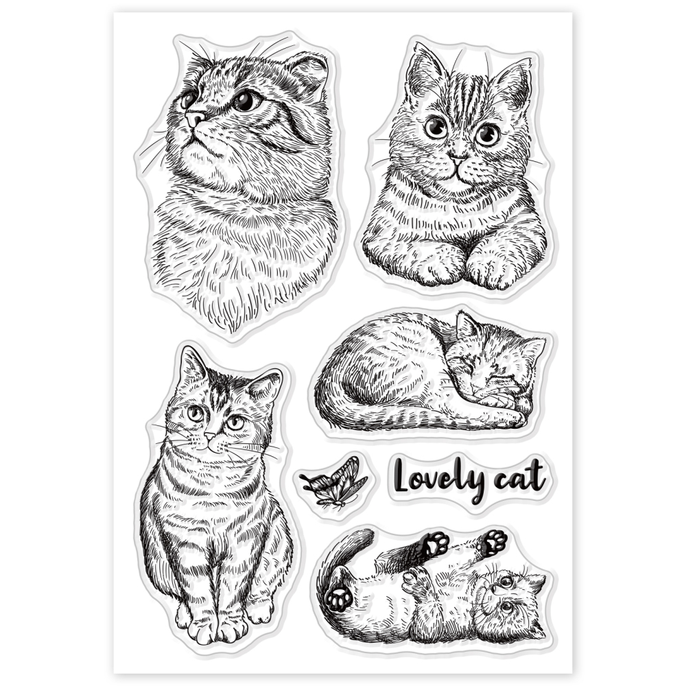 Silikonski štambilji veličina od 10×15 mm . Ukupno 7 motiva na temu mačke. Motivi su velićine od 20×16 mm (leptir), 40×10 mm (natpis Lovely cat), 60×30 mm (maca koja leži na leđima ), 58×30 mm (maca koja spava);75×40 mm (maca koja sjedi), 60×50 mm (glava mace s šapama u prvom planu) i glava mace 75×52 mm